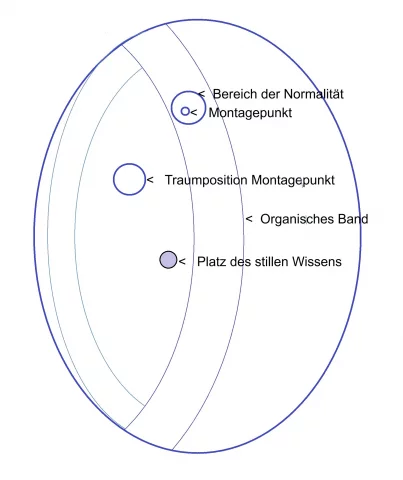 Der Energiekörper des Menschen und der Montagepunkt mit imaginärem Platz des Montagepunktes beim Träumen und der Platz des stillen Wissens.